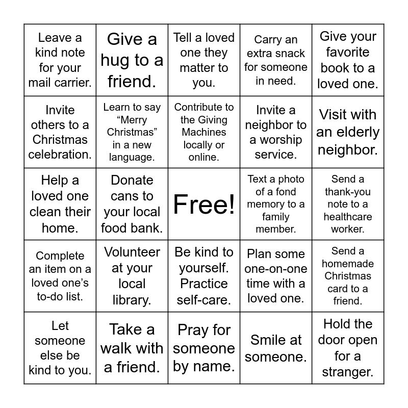 This bingo card has a free space and 50 words: Offer to teach someone a new skill., Hold the door open for a stranger., Host a family game night., Pray for someone by name., Volunteer at your local library., Pay for the person behind you at the store., Give a hug to a friend., Forgive someone., Invite others to a Christmas celebration., Call someone you miss., Learn to say “Merry Christmas” in a new language., Carry an extra snack for someone in need., Send a homemade Christmas card to a friend., Plan some one-on-one time with a loved one., Let a stranger go ahead of you in line., Be patient with waitstaff and customer service., Contribute to the Giving Machines locally or online., Text a photo of a fond memory to a family member., Learn how another culture celebrates Christmas., Give your favorite book to a loved one., Donate cans to your local food bank., Smile at someone., Leave a kind note for your mail carrier., Invite a neighbor to a worship service., Watch The Christ Child with family or friends., Leave an uplifting comment on social media., Visit with an elderly neighbor., Text someone, “I'm grateful for you.”, Tell a loved one they matter to you., Be kind to yourself. Practice self-care., Clean up trash in your community., Send a funny meme or video to a friend., Make a meal with a family member., Go caroling with a group., Take a walk with a friend., Post about a loved one using #LightTheWorld., Share a link to a holiday song that you love., Help someone research their family genealogy., Make a Christmas playlist and share it with a friend., Send a thank-you note to a healthcare worker., Stop to help someone who is having car trouble., Leave a gift on a neighbor’s doorstep., Support a local small business., Give your neighbor a compliment., Let someone else be kind to you., Help a loved one clean their home., Apologize to someone., Laugh with a friend., Complete an item on a loved one’s to-do list. and Ask a coworker how you can lighten their load..