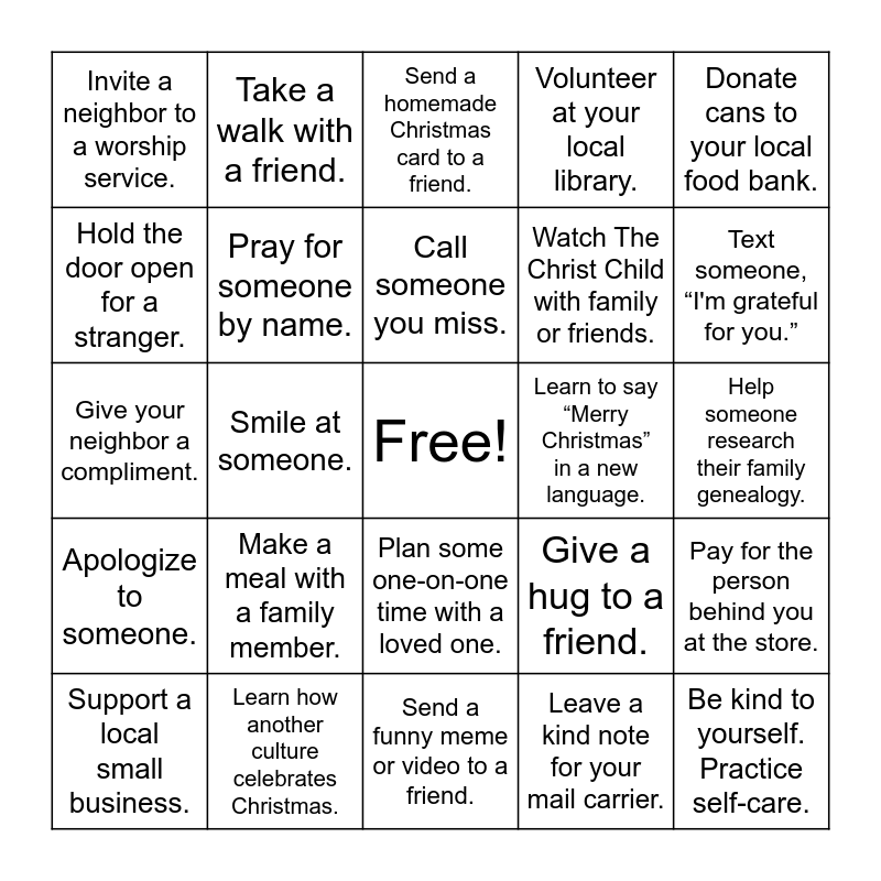 This bingo card has a free space and 50 words: Tell a loved one they matter to you., Be kind to yourself. Practice self-care., Clean up trash in your community., Send a funny meme or video to a friend., Make a meal with a family member., Go caroling with a group., Take a walk with a friend., Offer to teach someone a new skill., Hold the door open for a stranger., Host a family game night., Pray for someone by name., Volunteer at your local library., Pay for the person behind you at the store., Give a hug to a friend., Forgive someone., Invite others to a Christmas celebration., Call someone you miss., Learn to say “Merry Christmas” in a new language., Give your favorite book to a loved one., Donate cans to your local food bank., Smile at someone., Leave a kind note for your mail carrier., Invite a neighbor to a worship service., Watch The Christ Child with family or friends., Leave an uplifting comment on social media., Visit with an elderly neighbor., Text someone, “I'm grateful for you.”, Carry an extra snack for someone in need., Send a homemade Christmas card to a friend., Plan some one-on-one time with a loved one., Let a stranger go ahead of you in line., Be patient with waitstaff and customer service., Contribute to the Giving Machines locally or online., Text a photo of a fond memory to a family member., Learn how another culture celebrates Christmas., Complete an item on a loved one’s to-do list., Ask a coworker how you can lighten their load., Post about a loved one using #LightTheWorld., Share a link to a holiday song that you love., Help someone research their family genealogy., Make a Christmas playlist and share it with a friend., Send a thank-you note to a healthcare worker., Stop to help someone who is having car trouble., Leave a gift on a neighbor’s doorstep., Support a local small business., Give your neighbor a compliment., Let someone else be kind to you., Help a loved one clean their home., Apologize to someone. and Laugh with a friend..