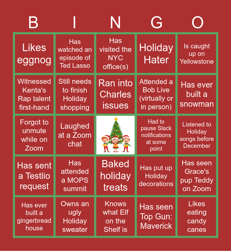 This bingo card has a free space and 24 words: Has attended a MOPS summit, Owns an ugly Holiday sweater, Ran into Charles issues, Has ever built a gingerbread house, Is caught up on Yellowstone, Likes eggnog, Witnessed Kenta's Rap talent first-hand, Has watched an episode of Ted Lasso, Had to pause Slack notifications at some point, Baked holiday treats, Attended a Bob Live (virtually or in person), Forgot to unmute while on Zoom, Has put up Holiday decorations, Has seen Grace's pup Teddy on Zoom, Still needs to finish Holiday shopping, Has seen Top Gun: Maverick, Listened to Holiday songs before December, Has visited the NYC office(s), Has ever built a snowman, Laughed at a Zoom chat, Likes eating candy canes, Has sent a Testlio request, Holiday Hater and Knows what Elf on the Shelf is.
