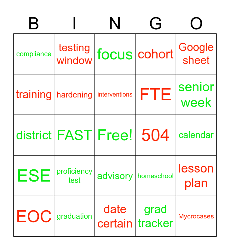 This bingo card has a free space and 24 words: proficiency test, graduation, interventions, EOC, Google sheet, compliance, training, testing window, 504, advisory, FTE, district, homeschool, lesson plan, hardening, grad tracker, calendar, focus, senior week, FAST, Mycrocases, ESE, cohort and date certain.