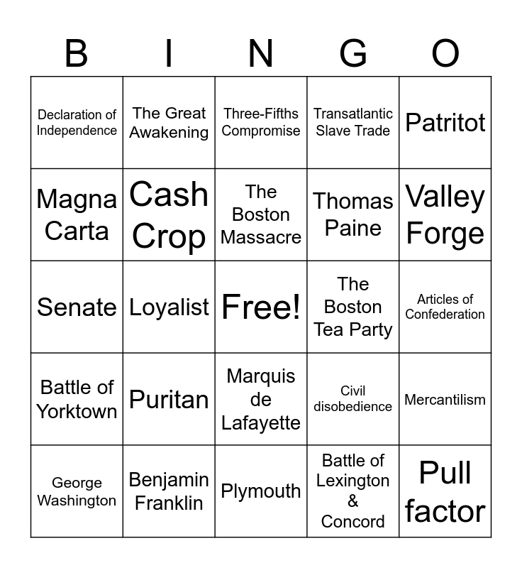 This bingo card has a free space and 49 words: Push factor, Pull factor, Jamestown, Plymouth, Puritan, Religious tolerance, The Great Awakening, The Quakers, Magna Carta, Mayflower Compact, Cash Crop, Transatlantic Slave Trade, Mercantilism, Civil disobedience, French & Indian War, The Stamp Act, The Boston Massacre, The Boston Tea Party, The Intolerable Acts, Patritot, Loyalist, Battle of Lexington & Concord, Declaration of Independence, Thomas Paine, Battle of Saratoga, Valley Forge, George Washington, General Cornwallis, Marquis de Lafayette, Battle of Yorktown, Treaty of Paris, James Armistead, Mercy Otis Warren, Wentworth Cheswell, Benjamin Franklin, Thomas Jefferson, Appalachian Mountains, Mississippi River, Articles of Confederation, Constitutional Convention of 1787, Northwest Ordinance, Shay's Rebellion, The Great Compromise, The House of Representatives, Senate, Three-Fifths Compromise, Federalist, Anti-Federalist and The U.S. Constitution.