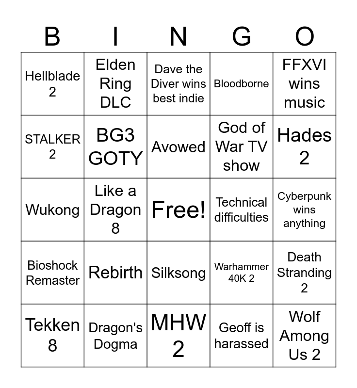 This bingo card has a free space and 24 words: Rebirth, Dragon's Dogma, Avowed, Tekken 8, FFXVI wins music, Hellblade 2, STALKER 2, Elden Ring DLC, Technical difficulties, Silksong, God of War TV show, Wukong, Warhammer 40K 2, Death Stranding 2, BG3 GOTY, Geoff is harassed, Cyberpunk wins anything, Dave the Diver wins best indie, Hades 2, Like a Dragon 8, Wolf Among Us 2, Bioshock Remaster, Bloodborne and MHW 2.