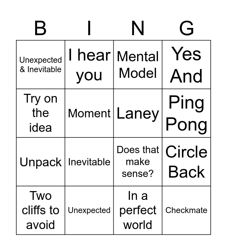 This bingo card has 16 words: Unexpected, Circle Back, Mental Model, Unexpected & Inevitable, Unpack, I hear you, Does that make sense?, In a perfect world, Try on the idea, Moment, Two cliffs to avoid, Yes And, Inevitable, Ping Pong, Laney and Checkmate.