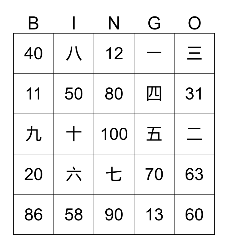 This bingo card has a free space and 24 words: 六, 58, 80, 86, 三, 40, 11, 八, 五, 七, 四, 九, 70, 63, 50, 13, 二, 12, 31, 十, 60, 20, 一 and 90.
