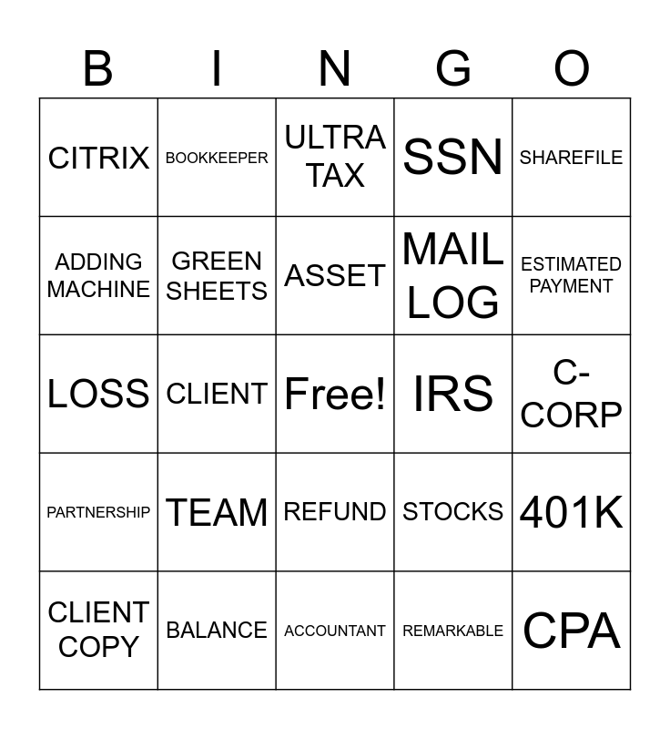 This bingo card has a free space and 51 words: SALES, CPA, ADMIN, ACCOUNTANT, TEAM, UNITED WAY, BOOKKEEPER, OFFICE ELF, ADDING MACHINE, PENCIL, GREEN SHEETS, SSN, 401K, STOCKS, BONDS, LEDGER, ASSET, IRS, TREASURY, SHAREFILE, CLIENT, REMARKABLE, CITRIX, MAIL LOG, G-FILEROOM, GRUNTWORX, ESTIMATED PAYMENT, TOSHIBA, CLIENT COPY, ULTRA TAX, NON-PROFIT, LEADER, ONE WAY, FAX, FILE CABINET, BALANCE, LEDGER, LLC, LLP, S-CORP, C-CORP, PARTNERSHIP, RETIREMENT, 401K, QC, PROFIT, LOSS, LIABILITY, STOCKS, REFUND and NOTICE.