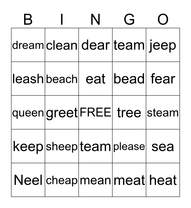 This bingo card has a free space and 24 words: sheep, cheap, eat, Neel, jeep, dream, leash, clean, tree, team, bead, queen, please, sea, beach, meat, steam, dear, fear, greet, heat, keep, team and mean.