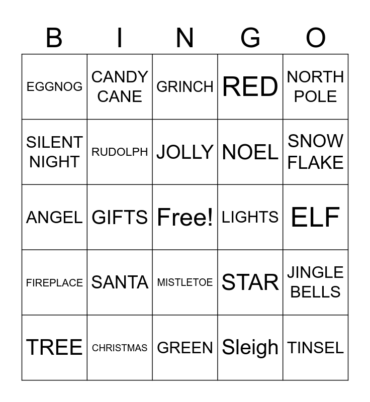 This bingo card has a free space and 24 words: SANTA, CHRISTMAS, JOLLY, TREE, NORTH POLE, EGGNOG, SILENT NIGHT, CANDY CANE, LIGHTS, MISTLETOE, NOEL, ANGEL, STAR, JINGLE BELLS, RUDOLPH, Sleigh, ELF, GRINCH, SNOW FLAKE, GIFTS, TINSEL, FIREPLACE, RED and GREEN.