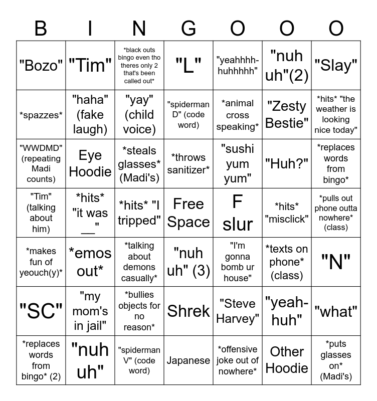This bingo card has a free space and 48 words: "Steve Harvey", "Zesty Bestie", Japanese, *hits* "it was __", *steals glasses* (Madi's), *pulls out phone outta nowhere* (class), "Tim", "nuh uh", "nuh uh"(2), "nuh uh" (3), "Slay", "L", "Huh?", "sushi yum yum", "SC", *hits* "misclick", *spazzes*, *hits* "the weather is looking nice today", "yeah-huh", "yeahhhh-huhhhhh", *animal cross speaking*, *hits* "I tripped", "Bozo", "haha" (fake laugh), "what", "yay" (child voice), *replaces words from bingo*, *replaces words from bingo* (2), *throws sanitizer*, Eye Hoodie, Other Hoodie, F slur, "N", "my mom's in jail", "Tim" (talking about him), "I'm gonna bomb ur house", *texts on phone* (class), "WWDMD" (repeating Madi counts), *talking about demons casually*, *bullies objects for no reason*, *makes fun of yeouch(y)*, *puts glasses on* (Madi's), *black outs bingo even tho theres only 2 that's been called out*, "spiderman V" (code word), "spiderman D" (code word), Shrek, *emos out* and *offensive joke out of nowhere*.