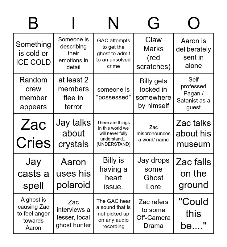 This bingo card has a free space and 39 words: "The most compelling evidence we've ever captured.", "Intelligent Responses", Zac taunts a ghost, at least 2 members flee in terror, A ghost is causing Zac to feel anger towards Aaron, Billy is having a heart issue., someone is "possessed", DEBUNKED, Aaron is deliberately sent in alone, Jay casts a spell, Jay talks about crystals, Claw Marks (red scratches), "Could this be....", Zac talks about his museum, Zac mispronounces a word/ name, Aaron uses his polaroid, GOOSEBUMPS, Something is cold or ICE COLD, Its a Demon, Jay drops some Ghost Lore, Random crew member appears, The GAC hear a sound that is not picked up on any audio recording, Billy gets locked in somewhere by himself, Self professed Pagan / Satanist as a guest, Zac is using at least 3 cameras at once, Spirit Box, The Video Ovilus, Someone is texting a ghost, Paranormal Orb, Someone is describing their emotions in detail, Kinect camera, Medium channels a ghost, GAC attempts to get the ghost to admit to an unsolved crime, Zac interviews a lesser, local ghost hunter, Zac refers to some Off-Camera Drama, Zac makes a comment about his own appearance, Zac falls on the ground, Zac Cries and A ghost is influencing Billy to do something.