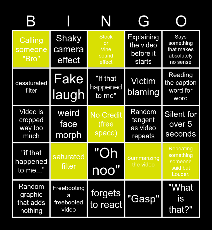 This bingo card has a free space and 24 words: saturated filter, Freebooting a freebooted video, "If that happened to me", Random graphic that adds nothing, Says something that makes absolutely no sense, Calling someone "Bro", desaturated filter, Shaky camera effect, Random tangent as video repeats, "Oh noo", Victim blaming, Video is cropped way too much, Summarizing the video, Repeating something someone said but Louder., Fake laugh, "Gasp", Silent for over 5 seconds, Stock or Vine sound effect, Reading the caption word for word, weird face morph, "What is that?", "if that happened to me...", Explaining the video before it starts and forgets to react.