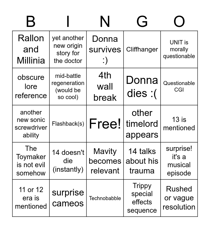 This bingo card has a free space and 24 words: 14 doesn't die (instantly), surprise cameos, 4th wall break, 11 or 12 era is mentioned, UNIT is morally questionable, Rallon and Millinia, obscure lore reference, yet another new origin story for the doctor, other timelord appears, Mavity becomes relevant, Donna dies :(, another new sonic screwdriver ability, 14 talks about his trauma, surprise! it's a musical episode, mid-battle regeneration (would be so cool), Trippy special effects sequence, 13 is mentioned, Donna survives :), Questionable CGI, Flashback(s), Rushed or vague resolution, The Toymaker is not evil somehow, Cliffhanger and Technobabble.
