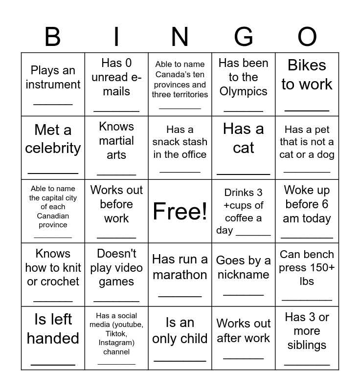 This bingo card has a free space and 46 words: Has been to Hawaii _______, Has 3 or more siblings _______, Plays on a sports team _______, Is an only child _______, Doesn't play video games _______, Does yoga ______, Has 0 unread e-mails _______, Grew up in Vancouver _______, Met a celebrity ______, Likes pineapple on pizza _______, Knows martial arts ______, Has been to the Olympics ______, Can bench press 150+ lbs ________, Goes by a nickname ______, Has been in a hot air balloon _______, Knows calligraphy ______, Has a snack stash in the office _______, Drinks 3 +cups of coffee a day ______, Has a favorite pen _____, Bikes to work _____, Works out before work ______, Works out after work ______, Plays an instrument ______, Has a cat ______, Has a dog _____, Has a pet that is not a cat or a dog ________, Is left handed _____, Has read ≥ 10 books this year _______, Has run a marathon ______, Knows how to knit or crochet ______, Has seen the same movie more than 5 times _______, Has worked at a restaurant ________, Went camping this year _______, Does not have a smart phone _________, Can speak more than 3 languages ________, Has a social media (youtube, Tiktok, Instagram) channel _________, Woke up before 6 am today ________, Reads comic books ______, Wears contact lenses _______, Has been on a on a cruise ship in the last year _______, Has ordered food for delivery at work _________, Able to name Canada’s ten provinces and three territories _________, Able to name the capital city of each Canadian province _________, Does not drink soda _______, Can speak French _______ and Saw a live concert this year ________.
