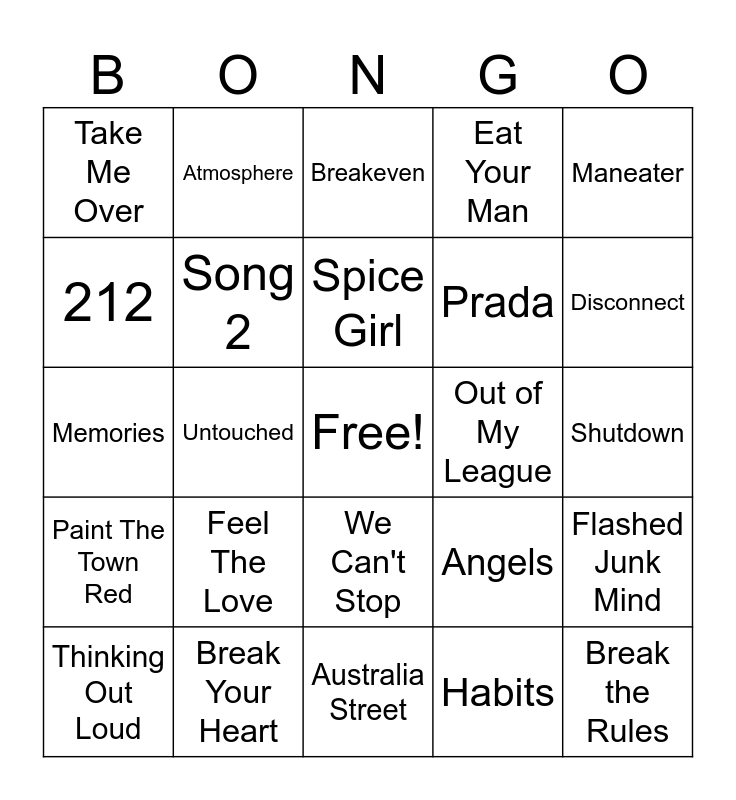 This bingo card has a free space and 65 words: Feeding the Family, Kick On, The Green Superintendent, Flashed Junk Mind, Seventeen Going Under, She Moves In Her Own Way, Atmosphere, Rhyme Dust, Spice Girl, Rolling in the Deep, We Can't Stop, Single Ladies, Shutdown, Maneater, Gimmie! Gimmie! Gimie!, 212, Untouched, Take Me Over, Feel So Close, Prada, Feel The Love, Paint The Town Red, Eat Your Man, Plain Jane, Levitating, Dancing in the Moonlight, Afraid to Feel, Can't Hold us, Break the Rules, Break Free, Thinking Out Loud, Cheap Thrills, Nice For What, Rude Boy, Angels, Break Your Heart, How To Save A Life, Memories, Habits, Fire and the Flood, Song 2, Walking on a Dream, Out of My League, Everybody Talks, Afterglow, One, Disconnect, Steal My Girl, Bitter, Bad Guy, Sending Me Ur Loving, Fashion Killa, Scar, Australia Street, WOW, Talk Dirty, In the Arms of a Stranger, Breakeven, Murder on the Dancefloor, Mixed Emotions, Oysters in My Pocket, Booster Seat, Touch it/Technologic, Praise You and Black Betty.