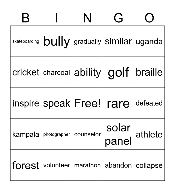 This bingo card has a free space and 34 words: koala, abandon, attach, apologize, kampala, charcoal, uganda, forest, bully, suggest, ability, gradually, realistic, role model, rare, braille, volunteer, inspire, photographer, solar panel, counselor, archery, skateboarding, defeated, marathon, collapse, similar, footgolf, golf, cricket, taekwondo, speak, athlete and benefit.
