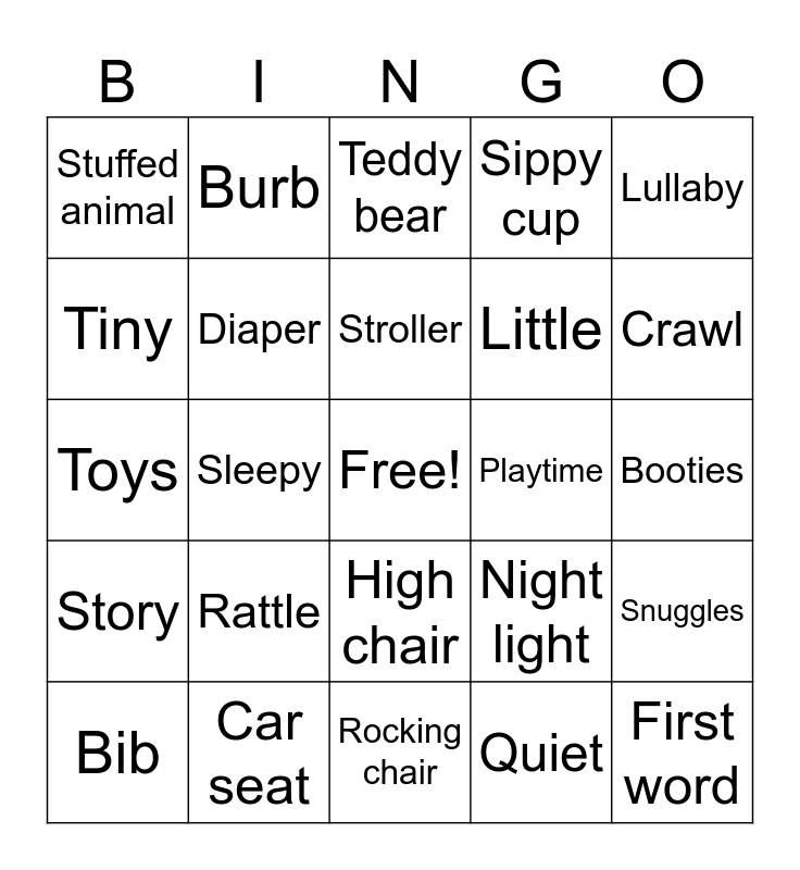 This bingo card has a free space and 33 words: Bottle, Nap, Sleepy, Onesie, Story, Diaper, Lullaby, Bib, Burb, Crib, Stroller, Teddy bear, Baby food, Blanky, Playtime, Crawl, Car seat, Toys, Rattle, Night light, High chair, Babysit, Stuffed animal, Booties, Rocking chair, First word, Sippy cup, Little, Tiny, Snuggles, Giggle, Quiet and Dream.