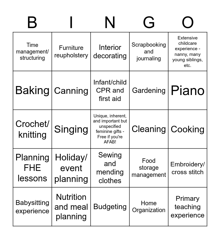 This bingo card has a free space and 24 words: Babysitting experience, Holiday/ event planning, Infant/child CPR and first aid, Home Organization, Extensive childcare experience - nanny, many young siblings, etc., Time management/ structuring, Furniture reupholstery, Interior decorating, Cleaning, Cooking, Crochet/ knitting, Canning, Food storage management, Embroidery/ cross stitch, Baking, Nutrition and meal planning, Budgeting, Scrapbooking and journaling, Piano, Planning FHE lessons, Singing, Sewing and mending clothes, Gardening and Primary teaching experience.