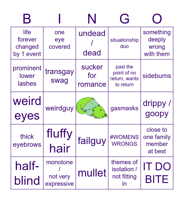 This bingo card has a free space and 24 words: fluffy hair, monotone / not very expressive, sucker for romance, half-blind, something deeply wrong with them, life forever changed by 1 event, prominent lower lashes, one eye covered, gasmasks, failguy, past the point of no return, wants to return, weird eyes, #WOMENS WRONGS, close to one family member at best, transgay swag, themes of isolation / not fitting in, drippy / goopy, undead / dead, sideburns, weirdguy, IT DO BITE, thick eyebrows, situationship duo and mullet.