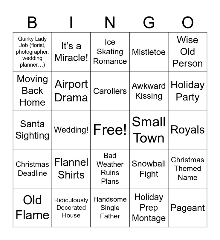 This bingo card has a free space and 45 words: Ethnic Friend who Gives Good Advice, Pageant, Dead Parent, Old Flame, Hot Chocolate, Holiday Prep Montage, Ice Skating Romance, Cookie Baking, Wise Old Person, Ridiculously Decorated House, Mistletoe, Small Town, Bad Weather Ruins Plans, Flannel Shirts, Weird Christmas Song, Handsome Single Father, Proposal That Happens Way Too Soon, Santa Sighting, Big Bad Corporation, Holiday Party, It’s a Miracle!, Terrible Child Acting, Real Estate!, Quirky Lady Job (florist, photographer, wedding planner…), Sleigh Ride, Royals, Almost Kiss, Strangely Wise Children, Snowball Fight, Christmas Deadline, Ugly Sweaters, Christmas Themed Name, Low-Key Criminal Activity, Child Wants a New Mom/Dad, Made-up European Country, Wedding!, Dumped Before Christmas, Terrible Phone Acting, Successful, Beautiful, Established Woman is NOT Happy, Carollers, Moving Back Home, Awkward Kissing, Kooky Townsfolk, Airport Drama and Previously famous actor getting a paycheck.