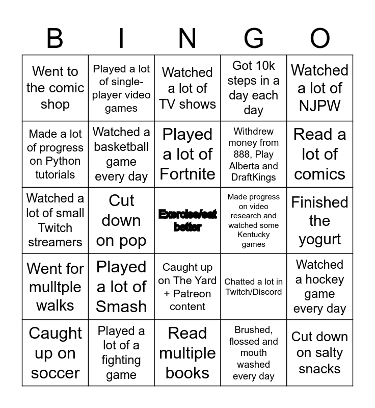 This bingo card has a free space and 24 words: Played a lot of Smash, Played a lot of a fighting game, Played a lot of Fortnite, Caught up on soccer, Watched a lot of NJPW, Went to the comic shop, Made a lot of progress on Python tutorials, Played a lot of single-player video games, Made progress on video research and watched some Kentucky games, Caught up on The Yard + Patreon content, Withdrew money from 888, Play Alberta and DraftKings, Watched a lot of small Twitch streamers, Chatted a lot in Twitch/Discord, Watched a hockey game every day, Watched a basketball game every day, Brushed, flossed and mouth washed every day, Finished the yogurt, Watched a lot of TV shows, Read a lot of comics, Cut down on pop, Cut down on salty snacks, Went for mulltple walks, Got 10k steps in a day each day and Read multiple books.