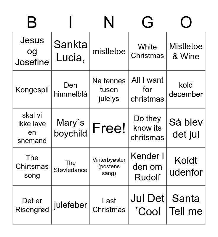 This bingo card has a free space and 41 words: Santa Claus is comin to town, skal vi ikke lave en snemand, jeg så julemanden kysse mor, Den himmelblå, julefeber, Vinterbyøster (postens sang), Na tennes tusen julelys, Glade jul, Mistletoe & Wine, The Chirtsmas song, Mary´s boychild, White Christmas, Santa Tell me, Så blev det jul, Do they know its chritsmas, The Støvledance, Let it snow let it snow, Jesus og Josefine, Cool Jul (pyrus), mistletoe, Koldt udenfor, Let love be love, Last Christmas, All I want for christmas, koldere end januar, Jul i Angora, Jul Det´Cool, Bjældeklang, kold december, Guld Jul, Juletræet med sin pynt, Sankta Lucia,, Det er Risengrød, Mey Mor, Kender I den om Rudolf, Kongespil, Søren Banjomus, Lille Store Verden, Til Julebal i Nisseland, På loftet sidder nissen and Tinka.