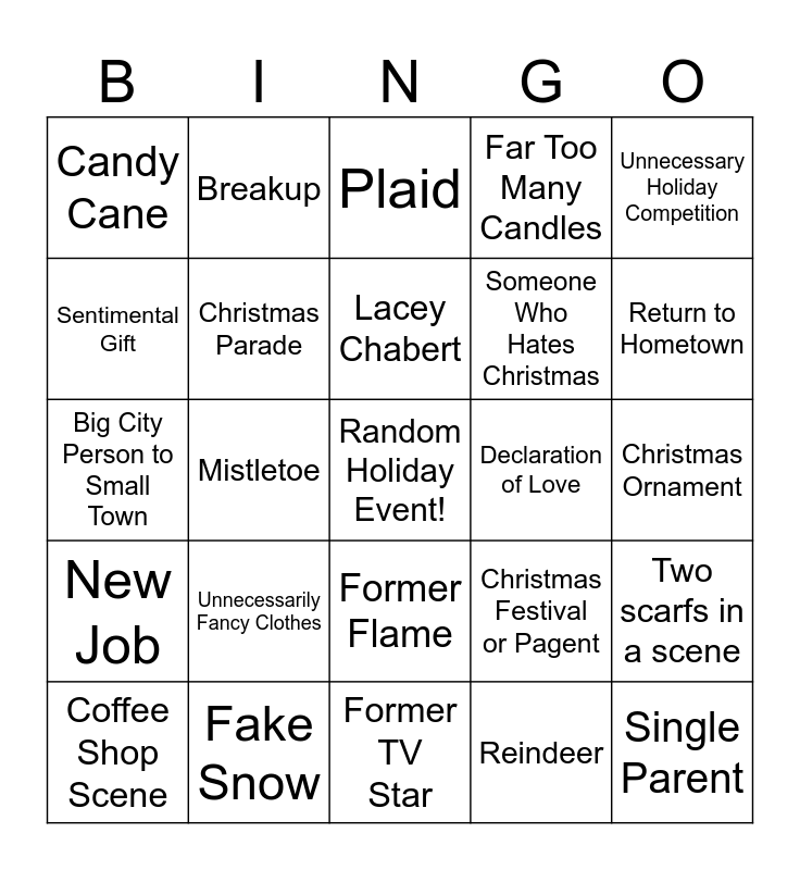 This bingo card has a free space and 29 words: Coffee Shop Scene, Nutcracker, Mistletoe, Eggnog, Candy Cane, Plaid, Christmas Parade, Unnecessarily Fancy Clothes, Declaration of Love, Fake Snow, Christmas Ornament, Single Parent, Former TV Star, Reindeer, Return to Hometown, Santa Hat, Former Flame, New Job, Unnecessary Holiday Competition, Big City Person to Small Town, Christmas Festival or Pagent, Christmas Pun Name, Someone Who Hates Christmas, Sentimental Gift, Far Too Many Candles, Breakup, Two scarfs in a scene, Lacey Chabert and Saving a Family Business.
