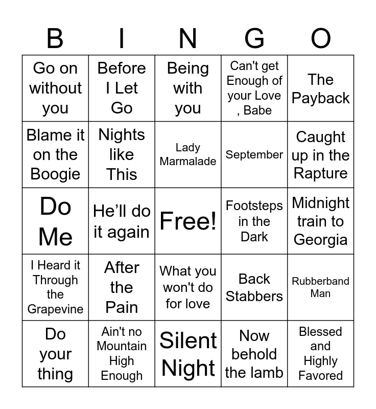 This bingo card has a free space and 27 words: Back Stabbers, Rock with you, September, Silent Night, Blame it on the Boogie, Being with you, Before I Let Go, I Heard it Through the Grapevine, Footsteps in the Dark, Rubberband Man, Do Me, Can't get Enough of your Love , Babe, Do your thing, Ain't no Mountain High Enough, Caught up in the Rapture, I'm Every Woman, Nights like This, Lady Marmalade, After the Pain, Go on without you, Midnight train to Georgia, Now behold the lamb, He’ll do it again, Blessed and Highly Favored, What you won't do for love, The Payback and Because I Love you.