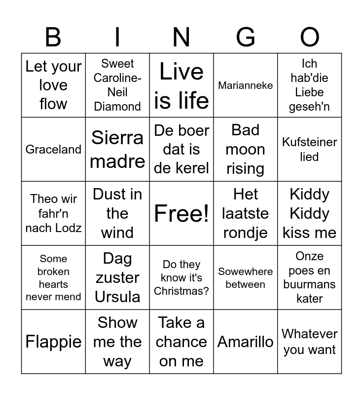 This bingo card has a free space and 106 words: Last Christmas-Wham, Het land van maas en waal, Ich hab'die Liebe geseh'n, Dancing Queen, Marmor,stein und Eisen bricht, Wake up little Susie, All I want fot Crhistmas is you, Johnny B. goode, Mon Amour, You're the greatest lover, One way wind, Surfing USA, Brabant, Schon ist es auf der welt ziu sein, Take it easy- Eagles, Coward of the county, Live is life, Jimmy-Boudewijn de Groot, Mrs Robinson, Verdammt ich lieb dich, Do they know it's Christmas?, Sjakie van de hoek, Driving home fot Christmas, Opzij, Rivers of Babylon, Dag zuster Ursula, Kufsteiner lied, Marianneke, Green green grass of home, Tanze mit mir in die morgen, Sowewhere between, Amarillo, The Boxer, Immer wieder Sonntags, Mamma Mia, Du, Ik verscheurde je foto, Disco inferno, De boer dat is de kerel, Gute nacht freunde, Sultans of swing, Visite, Suspicious Minds, Some broken hearts never mend, Rosamunde, Graceland, Happy xmas(war is over)-John Lennon, Let your love flow, Ein bisschen frieden, Whatever you want, Skandal im Sperrbezirk, Show me the way, Ein festival der liebe, Walk of live, Merry Christmas everyone- Shakin Stevens, Zwei kleine italiener, That's all right- Elvis, Junge, kommt bald wieder,, Ich bin wie Du, Sweet Caroline- Neil Diamond, Mull of Kintyre- Wings, Tequila Sunrise, Ring of fire, Wonderful Christmastime-Paul McCartney, Jackson, Malle Babbe, Jij krijgt die lach niet van mijn gezicht, Hee gaode mee, Bad moon rising, Theo wir fahr'n nach Lodz, Dust in the wind, Take a chance on me, Crazy little thing calles love, Bye bye love, Avond-Boudewijn de Groot, Start me up-Rolling stones, Take me home, country roads, Blue suede shoes, Thank gods it's Christmas- queen., Paint it black, Stayin Alive, Born to be alive, Let it snow let it snow,, Dance the night away, Santa Maria, Calypso, Het laatste rondje, Looking out my back door, Jolene, Zeven dagen lang, Een beetje verliefd, Monja, Chiquitita, Listen to the music, Wini wini, Onze poes en buurmans kater, Wunderbar, Met de vlam in de pijp, Its beginning to look a lot like.., Kiddy Kiddy kiss me, Sierra madre, Yellow submarine, Sinds 1 dag of 2, Blau bluht der Enzian, Flappie and Schone maid.