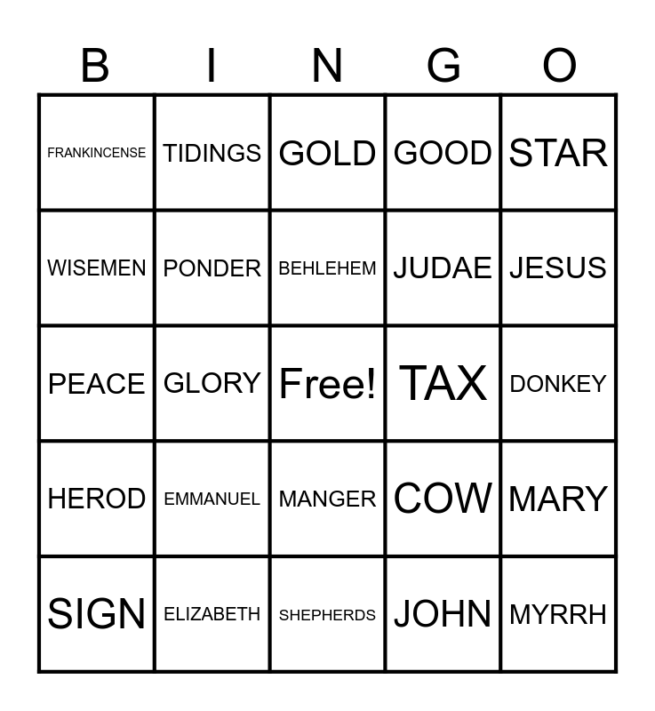 This bingo card has a free space and 28 words: MARY, WILL, JUDAE, JOHN, WISEMEN, GOLD, TIDINGS, HEROD, TAX, SIGN, PEACE, GOOD, ELIZABETH, SHEPHERDS, JESUS, JOY, EMMANUEL, PONDER, BEHLEHEM, MANGER, FRANKINCENSE, ANGEL, MYRRH, GLORY, DONKEY, COW, STAR and SHINING.
