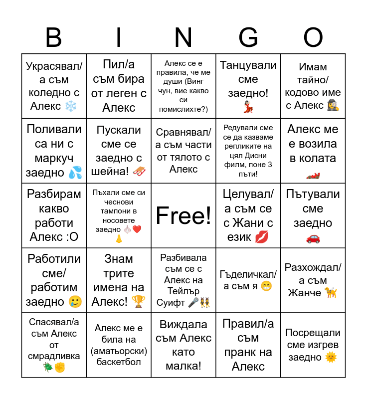 This bingo card has a free space and 24 words: Знам трите имена на Алекс! 🏆, Алекс ме е била на (аматьорски) баскетбол, Сравнявал/а съм части от тялото с Алекс, Спасявал/а съм Алекс от смрадливка 🪲✊, Имам тайно/кодово име с Алекс 🕵️♀️, Украсявал/а съм коледно с Алекс ❄️, Поливали са ни с маркуч заедно 💦, Пил/а съм бира от леген с Алекс, Целувал/а съм се с Жани с език 💋, Разбивала съм се с Алекс на Тейлър Суифт 🎤👯♀️, Редували сме се да казваме репликите на цял Дисни филм, поне 3 пъти!, Разбирам какво работи Алекс :О, Гъделичкал/а съм я 😁, Разхождал/а съм Жанче 🦮, Пускали сме се заедно с шейна! 🛷, Правил/а съм пранк на Алекс, Пътували сме заедно 🚗, Алекс се е правила, че ме души (Винг чун, вие какво си помислихте?), Алекс ме е возила в колата 🏎️, Пъхали сме си чеснови тампони в носовете заедно 🧄❤️👃, Посрещали сме изгрев заедно 🌞, Работили сме/работим заедно 🥲, Танцували сме заедно! 💃🏻 and Виждала съм Алекс като малка!.