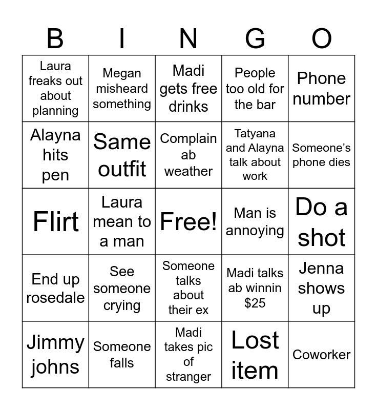 This bingo card has a free space and 29 words: Jimmy johns, Grinch, Laura mean to a man, Alayna stays out past 6, Laura freaks out about planning, Madi gets free drinks, Same outfit, See someone crying, Man is annoying, Someone falls, Do a shot, Coworker, Madi takes pic of stranger, Lost item, Someone’s phone dies, Kicked out of bar/bar fight, Someone talks about their ex, End up rosedale, Phone number, Flirt, Madi talks ab winnin $25, Tatyana talks ab roommate, Tatyana and Alayna talk about work, Alayna hits pen, People too old for the bar, Megan misheard something, Jenna shows up, Complain ab weather and Laura begs to go to Alice.