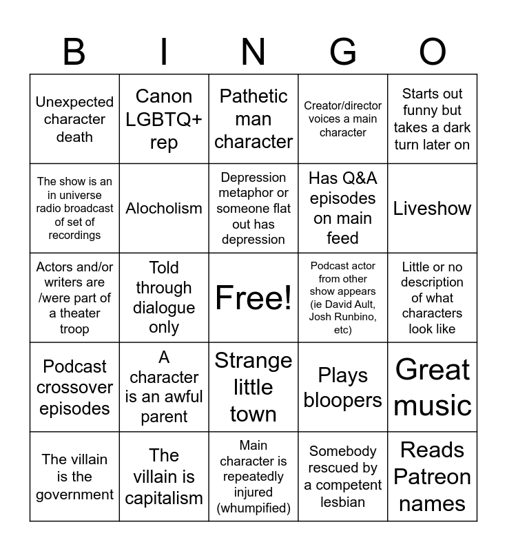 This bingo card has a free space and 26 words: Strange little town, Somebody rescued by a competent lesbian, Depression metaphor or someone flat out has depression, The villain is capitalism, Starts out funny but takes a dark turn later on, Unexpected character death, The show is an in universe radio broadcast of set of recordings, Canon LGBTQ+ rep, Little or no description of what characters look like, Plays bloopers, Has Q&A episodes on main feed, Actors and/or writers are /were part of a theater troop, Great music, The villain is the government, Told through dialogue only, Told through narration, Creator/director voices a main character, Podcast crossover episodes, Pathetic man character, Reads Patreon names, Liveshow, Main character is repeatedly injured (whumpified), Podcast actor from other show appears (ie David Ault, Josh Runbino, etc), A character is an awful parent, Alocholism and Canon POC character or VA.