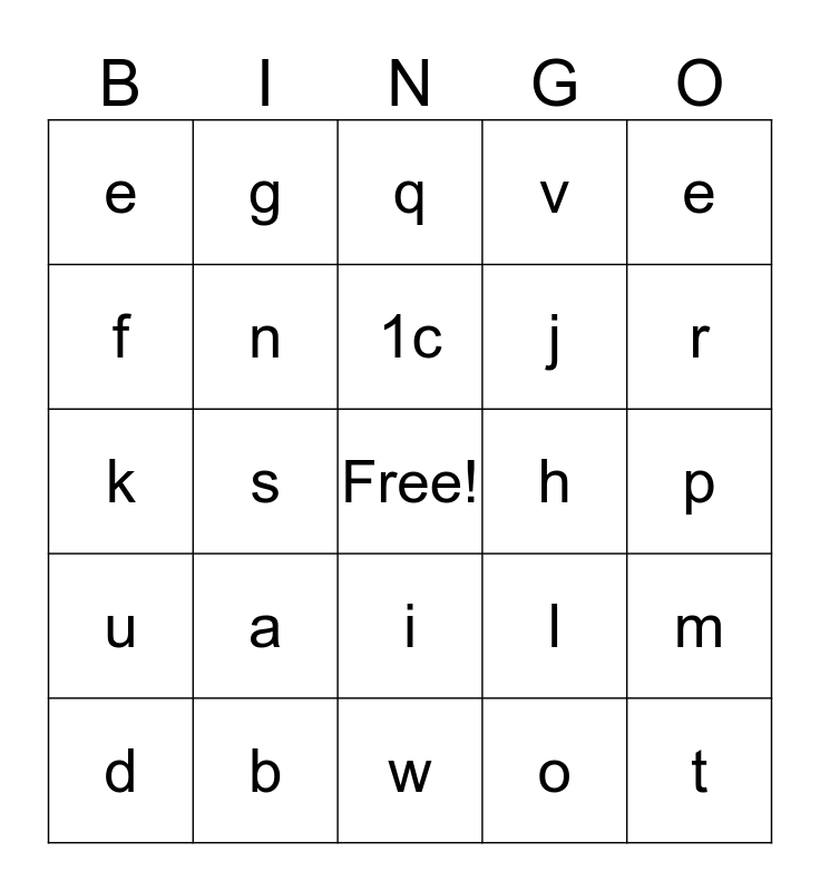 This bingo card has a free space and 24 words: a, b, 1c, d, e, e, f, g, h, i, j, k, l, m, n, o, p, q, r, s, t, u, v and w.