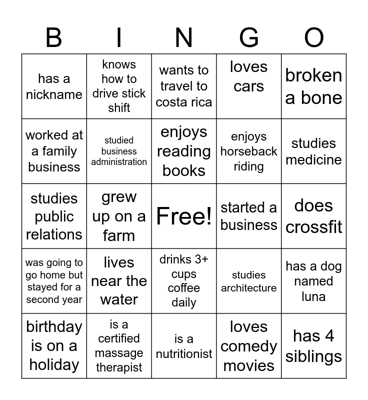 This bingo card has a free space and 24 words: lives near the water, is a certified massage therapist, enjoys reading books, birthday is on a holiday, broken a bone, has a nickname, worked at a family business, knows how to drive stick shift, started a business, drinks 3+ cups coffee daily, enjoys horseback riding, studies public relations, studies architecture, has a dog named luna, studied business administration, loves comedy movies, does crossfit, wants to travel to costa rica, studies medicine, grew up on a farm, has 4 siblings, was going to go home but stayed for a second year, loves cars and is a nutritionist.