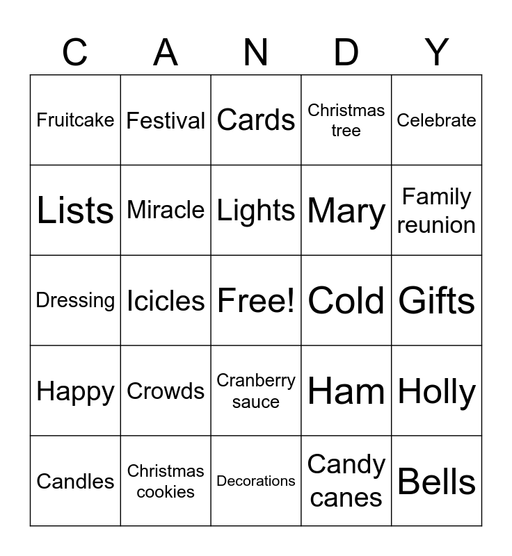 This bingo card has a free space and 43 words: Angels, Bells, Bethlehem, Candles, Candy, Candy canes, Cards, Cedar, Celebrate, Christmas cookies, Christmas tree, Cold, Cranberry sauce, Crowds, December, Decorations, Dolls, Dressing, Eggnog, Family reunion, Festival, Fir, Frosty, Fruitcake, Gift boxes, Gifts, Goodwill, Greetings, Ham, Happy, Holiday, Holly, Holy, Icicles, Jesus, Jolly, Joseph, Lights, Lists, Mary, Merry, Miracle and Mistletoe.