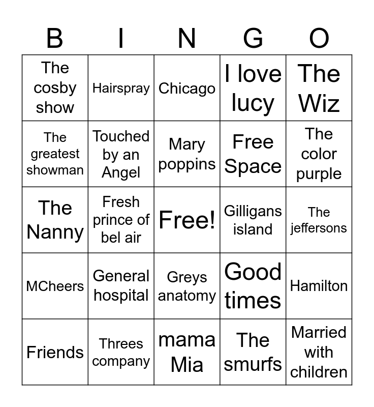 This bingo card has a free space and 32 words: The smurfs, Family matters, Fresh prince of bel air, Rent, MCheers, Touched by an Angel, The Wiz, Hamilton, Hairspray, Annie, Mary poppins, Chicago, The BAckyardigans, Golden girls, Gilligans island, Tom and Jerry, Friends, The Nanny, Greys anatomy, General hospital, Good times, Sanford and son, The jeffersons, Threes company, Married with children, I love lucy, Free Space, The greatest showman, The cosby show, mama Mia, Black Panther and The color purple.