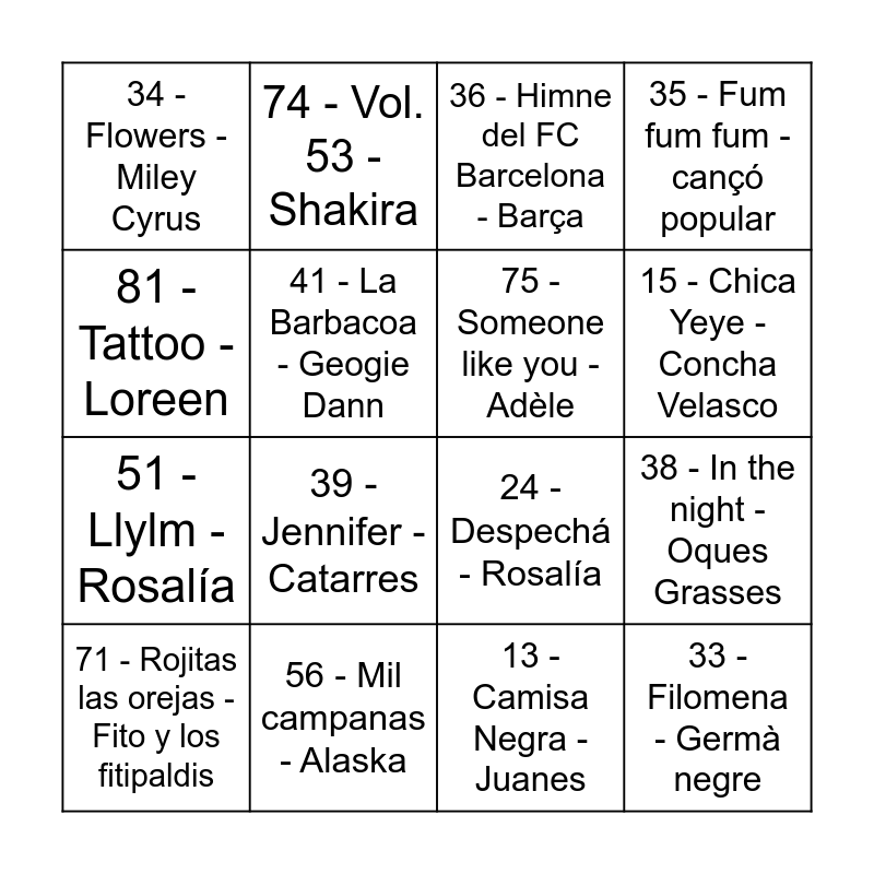 This bingo card has 91 words: Free!, 1 - Acróstico - Shakira, 2 - Alegria - Antònia Font, 3 - All I want for Xmas is you - Carey, 4 - Apropa’t - Itaca Band, 5 - Aquí és Nadal i estic content - La pegatina, 6 - Ave MAria - David Bisbal, 7 - Ay, mamá - Rigoberta Bandini, 8 - Bailando Bachata - Chayanne, 9 - Bella Ciao - Florent Hugel, 10 - Bon dia - Els Pets, 11 - Bonito - Pau Donés, 12 - Buleria - David Bisbal, 13 - Camisa Negra - Juanes, 14 - Cançó Bola de Drac - Bola de Drac, 15 - Chica Yeye - Concha Velasco, 16 - Chulo - Bad Gyal, 17 - Clavaíto - Chanel, 18 - Columbia - Quevedo, 19 - Come Out and Play - Offspring, 20 - Como una ola - Rocío Jurado, 21 - Coti x coti - The Tyets, 22 - Cupido - Tini, 23 - Despacito - Luis Fonsi, 24 - Despechá - Rosalía, 25 - El Merengue - Marshmello i Manuel Turizo, 26 - En peu de guerra - Els catarres, 27 - Escriurem - Miki Nuñez, 28 - Eso que tu me das - Pau Donés, 29 - Euphoria - Loreen, 30 - feel this moment - Christina Aguilera, 31 - Felices los cuatro - Maluma, 32 - Feliz Navidad - Thalia, 33 - Filomena - Germà negre, 34 - Flowers - Miley Cyrus, 35 - Fum fum fum - cançó popular, 36 - Himne del FC Barcelona - Barça, 37 - Ho tenim tot - Joan Dausà, 38 - In the night - Oques Grasses, 39 - Jennifer - Catarres, 40 - La Bachata - Manuel turizo, 41 - La Barbacoa - Geogie Dann, 42 - La cintura - Álvaro Soler, 43 - La mayonesa - Chocolate, 44 - La nòria - Stay Homas, 45 - LALA - Mike Towels, 46 - Las 12 - Ana Mena, 47 - Las babys - Aitana, 48 - Last Christmas - Wham, 49 - Let it be - The Beatles, 50 - Lluna a l’aigua - Txarango, 51 - Llylm - Rosalía, 52 - Los Ángeles - Aitana, 53 - M’agrada el nadal - Dàmaris Gelabert, 54 - Macarena - Los del Río, 55 - Mari Carmen - La Pegatina, 56 - Mil campanas - Alaska, 57 - Milionària - Rosalía, 58 - No hay tregua - Barricada, 59 - Nochentera - Vicco, 60 - Olívia - The Tyets, 61 - Pa amb oli i sal - Blaumut, 62 - Papa, vull ser torero - Albert Pla, 63 - Pasado pisado - Comando tiburón, 64 - Pelele - Morad, 65 - Pretty Woman - Roy Orbison, 66 - Quan somrius (és Nadal al meu cor) - Josep Thió, 67 - Que no s’acabi mai l’estiu - Figa Flawas, 68 - Quitate el top - Kiko rivera, 69 - Quedate - Quevedo, 70 - Quizás sí, quizás no - Álvaro Díaz, Quevedo, 71 - Rojitas las orejas - Fito y los fitipaldis, 72 - Sará perché ti amo - Ricchi e poveri, 73 - Sense tu - Teràpia de xoc, 74 - Vol. 53 - Shakira, 75 - Someone like you - Adèle, 76 - Son mis amigos - Amaral, 77 - Streets of Philadelphia - Bruce Springsteen, 78 - Súbeme la radio - Enrique Iglesias, 79 - Sweet Caroline - Neil Diamond, 80 - Tacones Rojos - Sebastián Yatra, 81 - Tattoo - Loreen, 82 - Taxi - Pitbull, 83 - Thriller - Michael Jackson, 84 - Tobogan - Zoo, 85 - Todo contigo - Álvaro de Luna, 86 - TQG - Shakira, 87 - Una noche sin pensar - Sebastián Yatra, 88 - Ventiladors - Zoo, 89 - Volcans - Buhos and 90 - Vull petar-ho - Oques grasses.