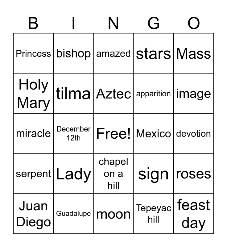 This bingo card has a free space and 24 words: Lady, Guadalupe, Aztec, Juan Diego, Mass, Princess, Holy Mary, bishop, Mexico, chapel on a hill, apparition, miracle, sign, roses, tilma, Tepeyac hill, devotion, amazed, image, December 12th, feast day, serpent, stars and moon.