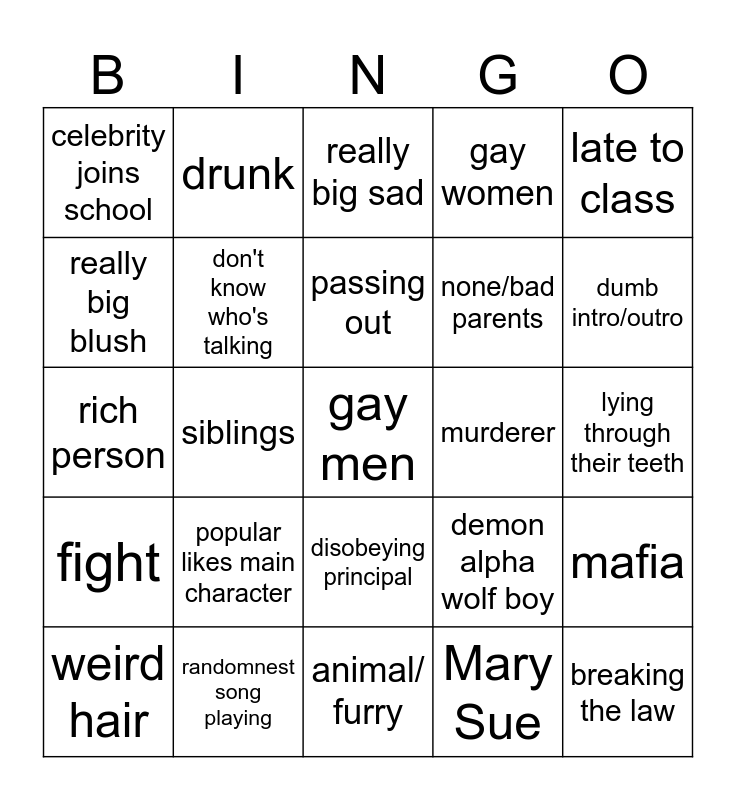 This bingo card has a free space and 27 words: demon alpha wolf boy, sibling couple, none/bad parents, animal/ furry, really big blush, really big sad, drunk, fight, murderer, mafia, rich person, gay women, weird hair, randomnest song playing, dumb intro/outro, cutscene, don't know who's talking, passing out, popular likes main character, celebrity joins school, lying through their teeth, Mary Sue, siblings, breaking the law, disobeying principal, late to class and teacher dumie.