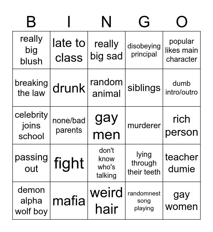 This bingo card has a free space and 29 words: demon alpha wolf boy, sibling couple, none/bad parents, animal/ furry, really big blush, really big sad, drunk, fight, murderer, mafia, rich person, gay women, weird hair, randomnest song playing, dumb intro/outro, cutscene, don't know who's talking, passing out, popular likes main character, celebrity joins school, lying through their teeth, Mary Sue, siblings, breaking the law, disobeying principal, late to class, teacher dumie, random animal and freebie.