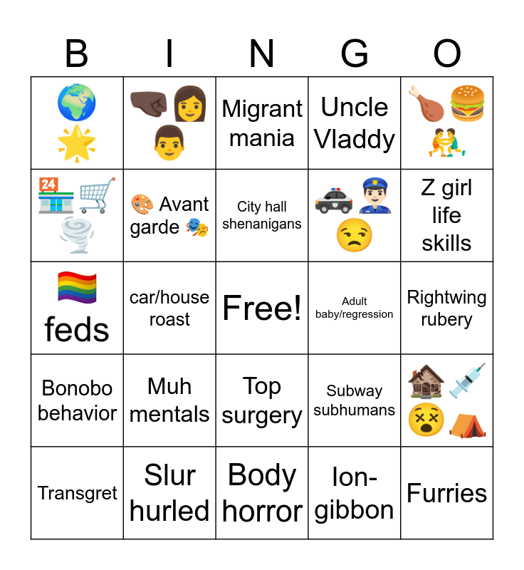 This bingo card has a free space and 24 words: Muh mentals, Slur hurled, City hall shenanigans, Transgret, 🍗🍔🤼♂️, 🌍🌟, 🏪🛒🌪️, 🤜🏿👩👨, Adult baby/regression, Top surgery, 🚓👮🏻♂️😒, 🏳️🌈feds, Subway subhumans, 🏚️💉😵⛺, 🎨 Avant garde 🎭, Ion-gibbon, Rightwing rubery, Migrant mania, Z girl life skills, car/house roast, Furries, Bonobo behavior, Uncle Vladdy and Body horror.