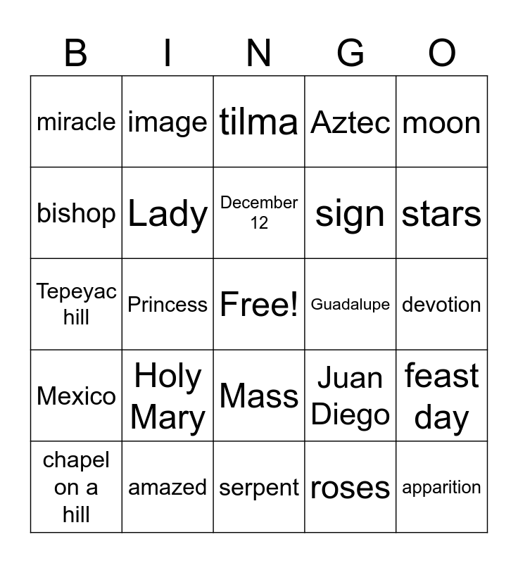 This bingo card has a free space and 24 words: Holy Mary, amazed, December 12, chapel on a hill, moon, miracle, bishop, image, Guadalupe, Mass, sign, Tepeyac hill, Juan Diego, feast day, Lady, roses, devotion, tilma, stars, Princess, apparition, Mexico, Aztec and serpent.