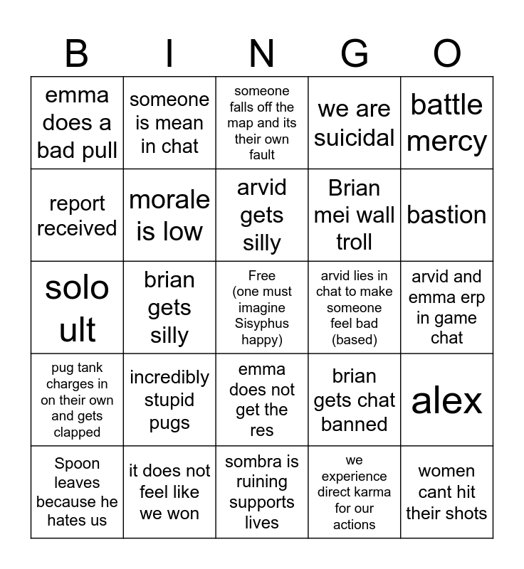 This bingo card has a free space and 24 words: Spoon leaves because he hates us, incredibly stupid pugs, arvid gets silly, we experience direct karma for our actions, battle mercy, emma does a bad pull, someone is mean in chat, someone falls off the map and its their own fault, arvid lies in chat to make someone feel bad (based), arvid and emma erp in game chat, solo ult, morale is low, brian gets chat banned, alex, report received, it does not feel like we won, sombra is ruining supports lives, we are suicidal, bastion, pug tank charges in on their own and gets clapped, brian gets silly, emma does not get the res, Brian mei wall troll and women cant hit their shots.
