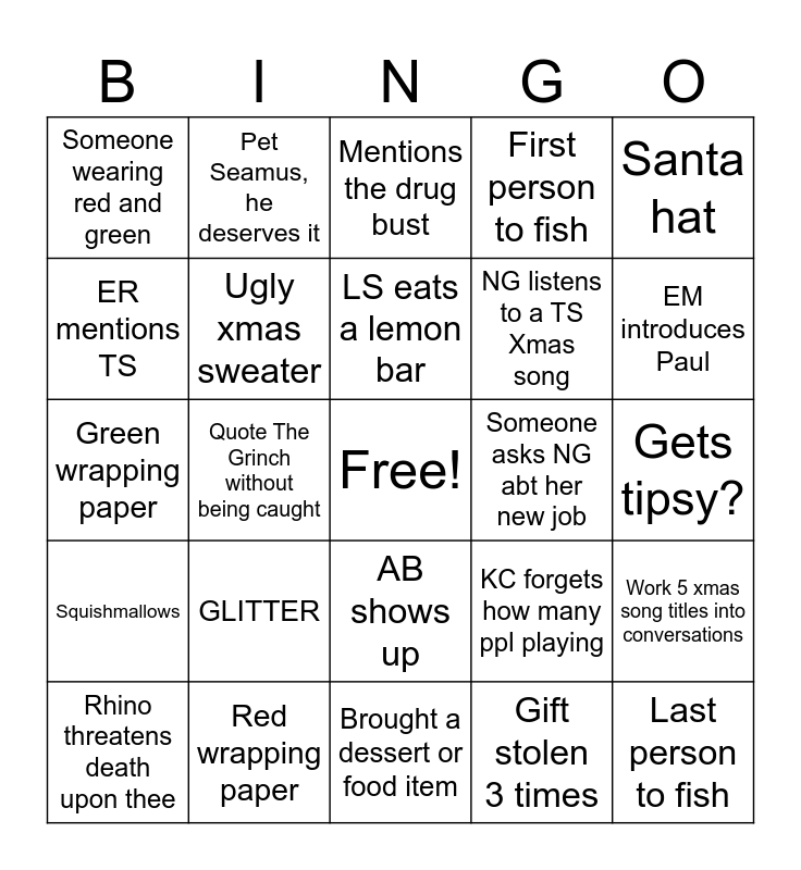 This bingo card has a free space and 34 words: KPS threatens to fire someone, Gift stolen 3 times, Gift stolen 2+ times IN A ROW, Drink a slush, Squishmallows, Ugly xmas sweater, Santa hat, Rhino threatens death upon thee, Pet Seamus, he deserves it, CHVH staff end up at the "Kids Table", LS eats a lemon bar, Mentions the drug bust, Sing a xmas song (out loud), No one wants to be first in food line, Someone asks NG abt her new job, EM introduces Paul, Red wrapping paper, Green wrapping paper, GLITTER, KC forgets how many ppl playing, AB shows up, Who has the most bourbon slushies, Someone wearing red and green, Gets tipsy?, Brought a dessert or food item, Last person to fish, First person to fish, LD wears xmas earrings, NG listens to a TS Xmas song, ER mentions TS, JA/CF whispering in corner, Quote The Grinch without being caught, Work 5 xmas song titles into conversations and Fajita blowout.