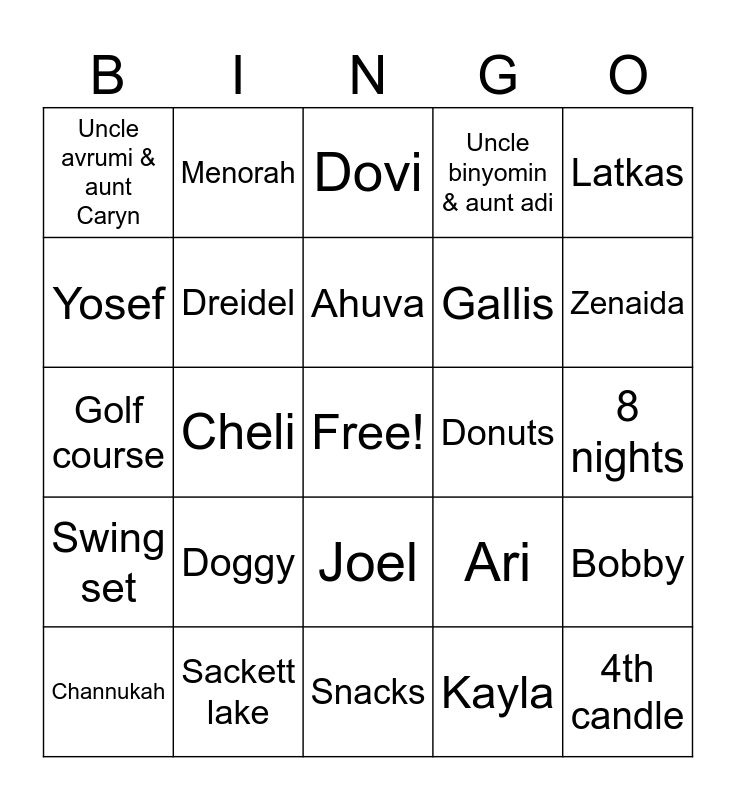 This bingo card has a free space and 24 words: Doggy, Sackett lake, Ahuva, Channukah, Latkas, Uncle avrumi & aunt Caryn, Yosef, Menorah, Donuts, Joel, Gallis, Golf course, Ari, Bobby, Dreidel, Kayla, 8 nights, Dovi, Zenaida, Cheli, 4th candle, Swing set, Uncle binyomin & aunt adi and Snacks.