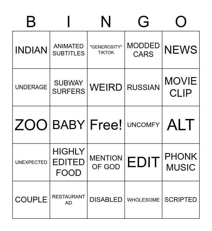 This bingo card has a free space and 53 words: THIRST TRAP, SCRIPTED, SKIT, WHOLESOME, HIGHLY EDITED FOOD, PODCAST, ANIMATED SUBTITLES, @ IN VIDEO, UNDERAGE, THIRST TRAP, SUBWAY SURFERS, GTA, PHONK MUSIC, EDIT, OBV DROPSHIP, COUPLE, WEIRD, UNCOMFY, DISGUSTING, NEWS, BABY, KOREAN, RUSSIAN, INDIAN, NEWS, RESTAURANT AD, CLEANING, 5 MINUTE CRAFTS, OVER 6 MINUTES, MOVIE CLIP, RNG CONTENT, GAMING, CAT, WEIRD FACT, GRWM, THIRD WORLD COUNTRY, MODDED CARS, DISABLED, "GENEROSITY" TIKTOK, CHIROPRACTOR, HOT MAN, SOULLESS REACTION, ALT, OPIUM, MENTION OF ALLAH, MENTION OF GOD, MENTION OF SATAN, MEATRIDER, ZOO, UNEXPECTED, ASMR, CONCERT and AUSTRALIAN.