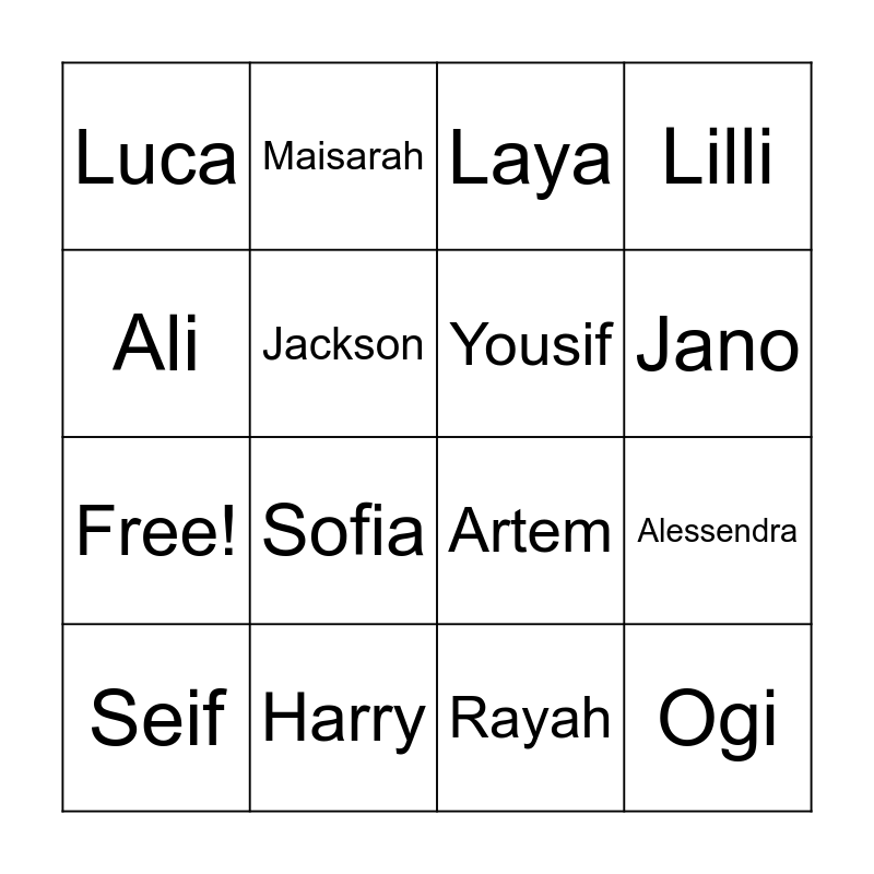 This bingo card has 20 words: Alessendra, Eva, Laya, Lydia, Seif, Ali, Harry, Luca, Free!, Maisarah, Sofia, Artem, Jackson, Ogi, Yousif, Dana, Jano, Lilli, Rayah and Dana.