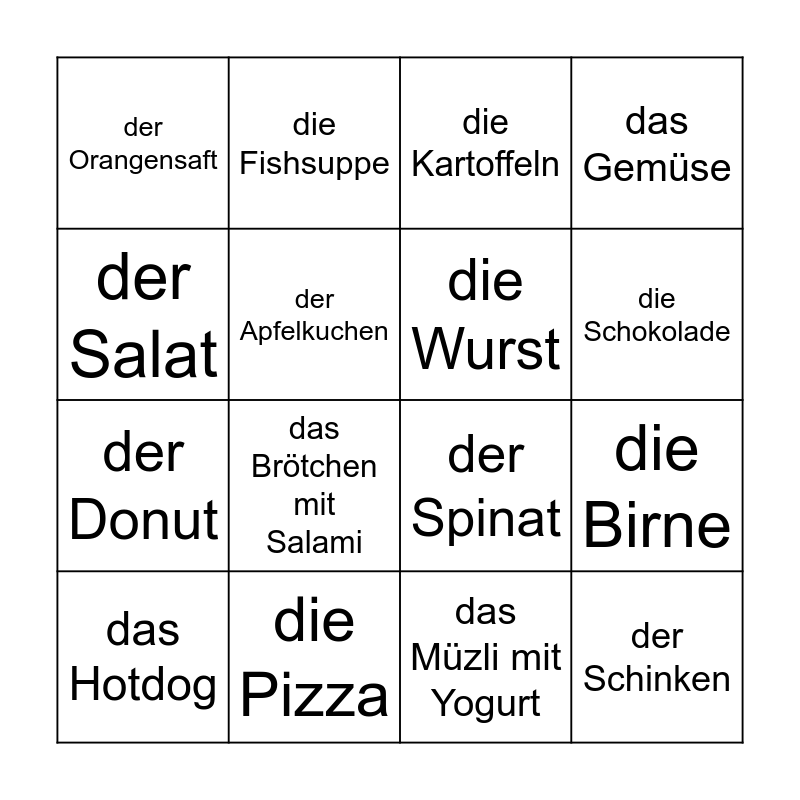 This bingo card has 16 words: die Pizza, die Birne, die Kartoffeln, der Orangensaft, der Donut, die Fishsuppe, der Spinat, das Müzli mit Yogurt, der Salat, der Apfelkuchen, das Hotdog, das Gemüse, das Brötchen mit Salami, die Schokolade, die Wurst and der Schinken.