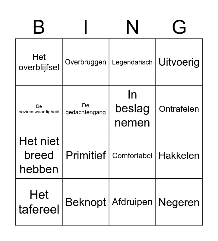 ⚠ This card has duplicate items: De impressie (2), Het tafereel (2), Luxueus (2), Primitief (2), De tijdspanne (2), In beslag nemen (2), Legendarisch (2)