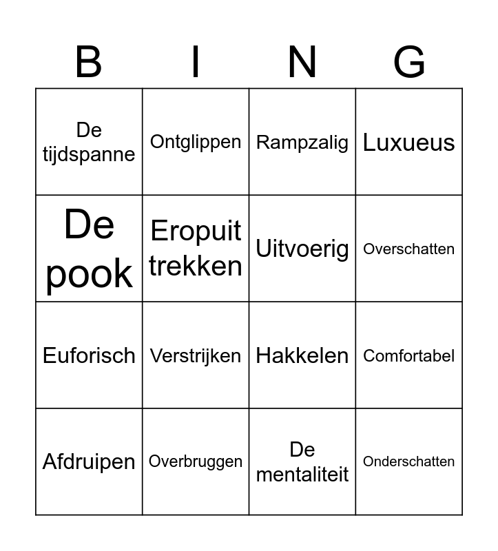 This bingo card has 36 words: De impressie, De bezienswaardigheid, Het tafereel, Uitvoerig, Beknopt, Onderschatten, Overschatten, Het dashboard, De pook, De contactsleutel, Comfortabel, Luxueus, Primitief, Overbruggen, Verstrijken, De tijdspanne, Het overblijfsel, Legendarisch, Afdruipen, Rampzalig, De mentaliteit, De verontreiniging, Negeren, Exclusief, De documentaire, Ontglippen, Hakkelen, Manoeuvreren, Euforisch, Eropuit trekken, Ontrafelen, De gedachtegang, Het niet breed hebben, De knoop doorhakken, In beslag nemen and De tijd vliegt.