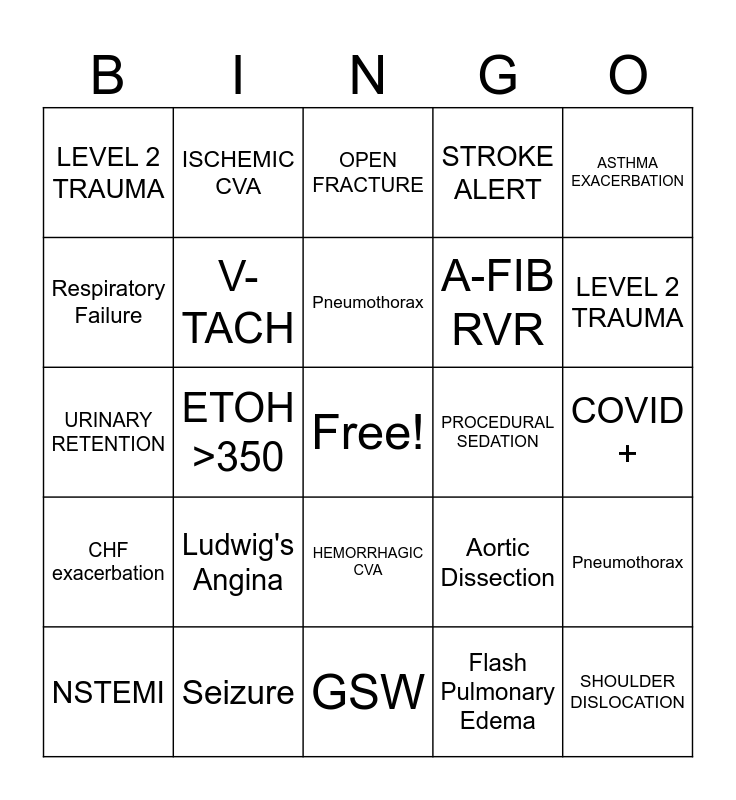 This bingo card has a free space and 57 words: STEMI, NSTEMI, LEVEL 1 TRAUMA, LEVEL 2 TRAUMA, GSW, SVT, V-TACH, A-FIB, A-FIB RVR, CODE BLUE, STROKE ALERT, HEAD BLEED, ANAPHYLAXIS, STAB WOUND, ROLLOVER MVC, CROUP, ASTHMA EXACERBATION, ETOH >350, HIP FRACTURE, SHOULDER DISLOCATION, PROCEDURAL SEDATION, AAA, Aortic Dissection, OPEN FRACTURE, RESTRAINTS, Pneumothorax, Open Fracture, LEVEL 1 TRAUMA, LEVEL 2 TRAUMA, LEVEL 1 TRAUMA, LEVEL 2 TRAUMA, STEMI, NSTEMI, Stroke Alert, COVID +, Respiratory Failure, Blood Transfusion, URINARY RETENTION, COMPARTMENT SYNDROME, CHF exacerbation, ISCHEMIC CVA, HEMORRHAGIC CVA, DKA, nursing home placement, Code Chill, Overdose, Ludwig's Angina, Seizure, Status Epilepticus, Alcohol Detox, Intubation, Flash Pulmonary Edema, COPD Exacerbation, CHF Exacerbation, Chest Tube, Pneumothorax and Hemothorax.